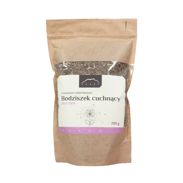 Bodziszek cuchnący (Geranium robertianum) – niewielka roślina o pierzastych liściach i drobnych różowych kwiatach, wydzielająca nieprzyjemny zapach. Rośnie najczęściej w lasach liściastych, w zaroślach lub przy torowiskach kolejowych. Występuje w Europie, Azji i Północnej Afryce. W Polsce jest gatunkiem powszechnym. Surowcem zielarskim jest kwitnące ziele bodziszka cuchnącego, w którego skład wchodzą: garbniki, flawonoidy, kwasy fenolowe, kwasy organiczne, geraniina oraz olejki eteryczne. Od wieków roślina ta znana jest zielarzom ze swoich właściwości ściągających, pomagających zahamować krwawienia i sprzyjających gojeniu się ran. Napary, odwary lub proszki z bodziszka cuchnącego można wykorzystać do przemywania podrażnionej skóry lub użyć w postaci regenerujących okładów. Bodziszek znajduje także zastosowanie wewnętrzne jako środek wpływający korzystnie na pracę nerek, wątroby i układu pokarmowego.