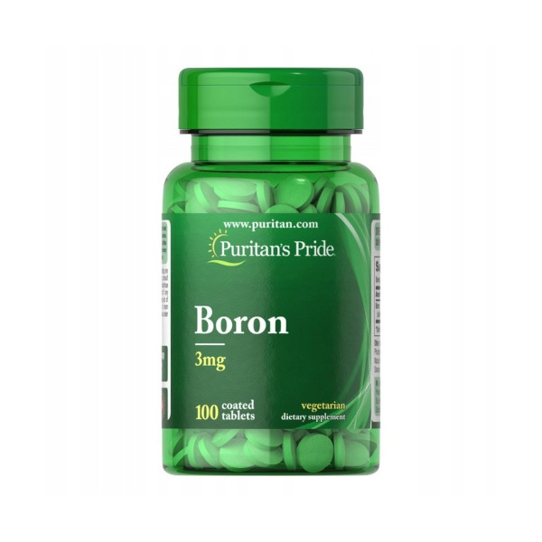 Boron marki Puritan's Pride to suplement diety w tabletkach powlekanych zawierając bor jako cytrynian boru i asparaginian boru.