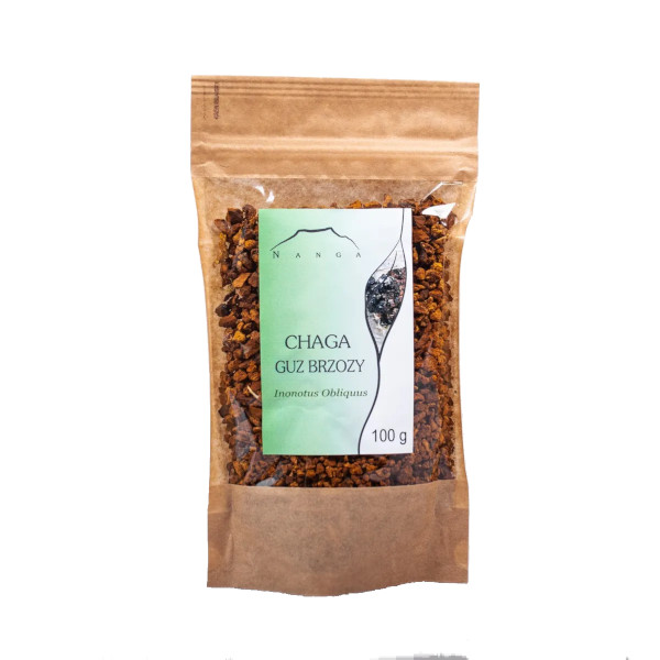 Chaga (Inonotus obliquus) – czyli błyskoporek podkorowy (huba brzozowa, guz brzozy), jest to grzyb o czarnej zewnętrznej barwie i rdzawym miąższu wewnątrz, będący charakterystyczną naroślą, występującą na pniach obumierających drzew, najczęściej brzóz. Występuje na chłodniejszych obszarach półkuli północnej. Inonotus obliquus wykazuje wiele korzystnych właściwości, które wynikają z zawartości takich związków bioaktywnych, jak polisacharydy, beta-glukany, fitosterole, betulina i kwas betulinowy (triterpeny), przeciwutleniacze (chaga posiada najwyższy wynik miary działania antyoksydacyjnego, według skali ORAC). W dawnej medycynie ludowej wywar ze sproszkowanego owocnika stosowano w dolegliwościach żołądkowych. Wierzono również, że spożywanie naparu oczyszcza organizm, redukuje ból oraz poprawia samopoczucie. Ze względu na szerokie spektrum pozytywnego oddziaływania na organizm regularne spożywanie tych grzybów skutkuje wzmocnieniem całego organizmu.