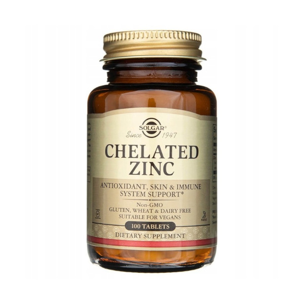 Chelated Zinc marki Solgar to suplement diety zawierający cynk w postaci 100% chelatu aminokwasowego. Chelaty aminokwasowe charakteryzują się najlepszą wchłanialnością.