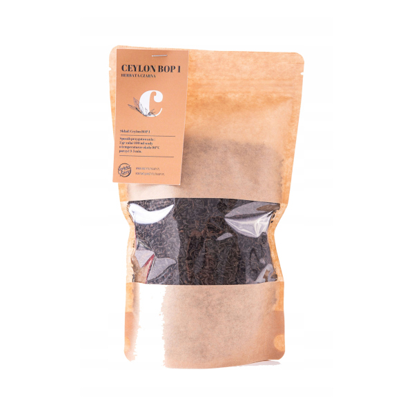 Herbata Ceylon BOP1 to czarna, intensywna herbata pochodząca z plantacji na wysokich wzgórzach Cejlonu, na Sri Lance. Prawidłowo zaparzona daje czerwono-brązowy napar o dość ostrym ale bardzo przyjemnym aromacie i smaku. Znakomicie wpływa na poprawę koncentracji i niweluje zmęczenie, ma również korzystny wpływ na układ trawienny, wspomaga wydzielanie soków żołądkowych. Delikatnie pobudza i rozjaśnia umysł. Szczególnie polecana jako herbata poranna dla wszystkich śpiochów.