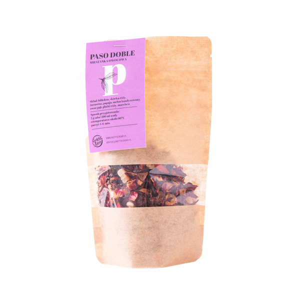 Herbata owocowa - susz o >50% zawartości owoców, na bazie hibiskusa. Mieszanka w kolorach czerwieni i różu inspirowana hiszpańskim tańcem pasodoble. Doskonale smakuje na gorąco, świetnie sprawdza się również jako baza lub dodatek do herbat mrożonych i lemoniad. Nie zawiera teiny. Dzięki dużej zawartości płatków hibiskusa działa przeciwzapalnie, wzmacnia odporność, łagodzi podrażnienia i pozytywnie wpływa na utrzymanie prawidłowego ciśnienia krwi. Otrzymany napar jest intensywnie owocowy, słodko-kwaskowy i złożony w smaku.