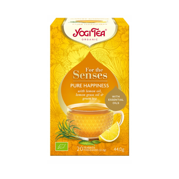 YOGI TEA® Czysta radość PURE HAPPINESS wznosi wrażliwość naszych zmysłów na wyższy poziom dzięki olejkom eterycznym orzeźwiającej trawy cytrynowej i kwaskowej cytryny.