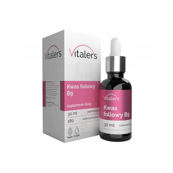 Kwas foliowy B9 marki Vitaler's to suplement diety w kroplach zawierający kwas foliowy. Kwas foliowy pomaga w utrzymaniu prawidłowych funkcji psychologicznych oraz funkcjonowaniu układu odpornościowego, pomaga w prawidłowej produkcji krwi i przyczynia się do zmniejszenia uczucia zmęczenia i znużenia.