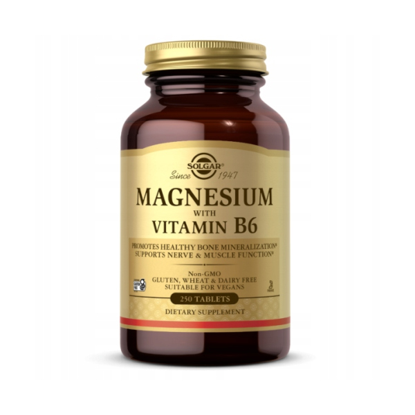 Magnesium with Vitamin B6 marki Solgar to suplement diety zawierający magnez w postaci tlenku magnezu oraz witamina B6 w postaci pirydoksynu chlorowodorku.