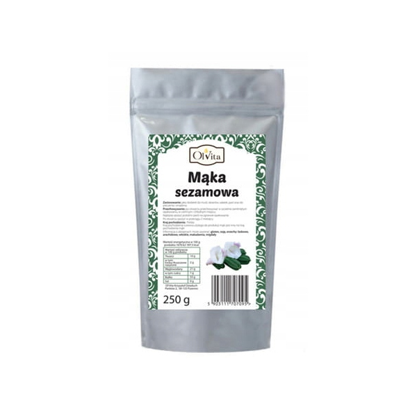 Mąka sezamowa 250g Olvita to delikatna mąka bogata w wiele składników odżywczych – witaminy z grupy B, wapń, miedź, magnez oraz błonnik.