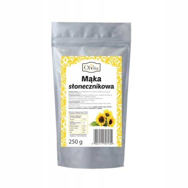 Mąka słonecznikowa 250g Olvita - mąka z częściowo odtłuszczonych, zmielonych ziaren słonecznika. Bogata w białko i niezbędne, nienasycone kwasy tłuszczowe. O przyjemnym zapachu słonecznika i lekko słodkim smaku.
