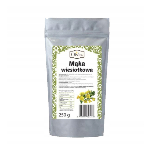 Mąka z wiesiołka Olvita 250g to ciemnobrązowa mąka z częściowo odtłuszczonych nasion wiesiołka. Idealna dla osób z problemami trawiennymi, chorobami skóry (trądzik) lub alergiami.