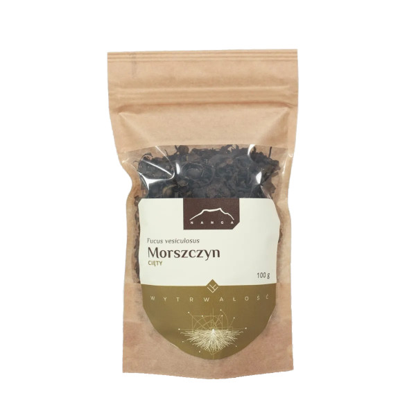 Morszczyn pęcherzykowaty (Fucus vesiculosus) – nazywany także kelpem, to glon morski należący do brunatnic. Charakteryzuje się oliwkową plechą, która pokryta jest licznymi pęcherzykami. Spotykany jest zwykle w chłodniejszych strefach Oceanu Atlantyckiego i Spokojnego oraz w Bałtyku i Morzu Północnym. Morszczyn znany jest z wysokiej zawartości jodu, ale obok niego obecne są także inne składniki mineralne: wapń, potas, fosfor, siarka, żelazo, cynk. Stanowi on źródło wielu cennych witamin oraz takich substancji aktywnych, jak: polisacharydy, kwas alginowy, fukoidyna, mannitol, lamiryna, liczne antyoksydanty i kwasy tłuszczowe. Od setek lat morszczyn pęcherzykowaty jest ważnym elementem codziennej diety ludności nadmorskiej. Tradycyjnie stosowany był jako środek regulujący perystaltykę jelit i wspomagający odchudzanie. Przygotowywano z niego również okłady kojące skórę. Morszczyn to dobre źródło błonnika wspierającego prawidłową pracę jelit i układu pokarmowego. Zawarty w nim jod korzystnie wpływa na metabolizm, a jego odpowiedni poziom w organizmie odpowiada za optymalną pracę gruczołu tarczycy. Produkt skierowany jest do osób, które pragną dostarczyć swojemu organizmowi dodatkowej dawki jodu oraz innych cennych składników o korzystnym wpływie na zdrowie.