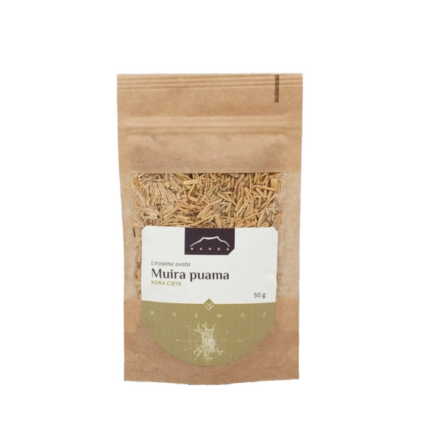 Muira Puama (Lirosima ovata) – drzewo z rodziny oliwkowatych, osiągające do 5 metrów wysokości. Naturalnie występuje w Brazylii, Kolumbii, Wenezueli oraz Peru. Cennym surowcem zielarskim jest kora drzewa muira puama, zawierająca takie substancje aktywne, jak: alkaloidy, kwasy tłuszczowe, kumaryna, fitosterole oraz olejki eteryczne. Roślina ta nazywana jest „drzewem potencji”, a to za sprawą jej właściwości podnoszących libido u mężczyzn i kobiet oraz wzmacniających sprawność seksualną u mężczyzn. Wśród ludności południowoamerykańskiej od wieków uważana jest za jeden z najlepszych naturalnych afrodyzjaków. Jednak oprócz głównego działania, muira puama wpływa także na wzrost ogólnej witalności oraz wspiera prawidłowe funkcjonowanie układu nerwowego. To egzotyczne ziółko polecane jest osobom pragnącym zwiększyć poziom zadowolenia ze swojego życia erotycznego, a przy okazji zadziałać wzmacniająco na organizm.
