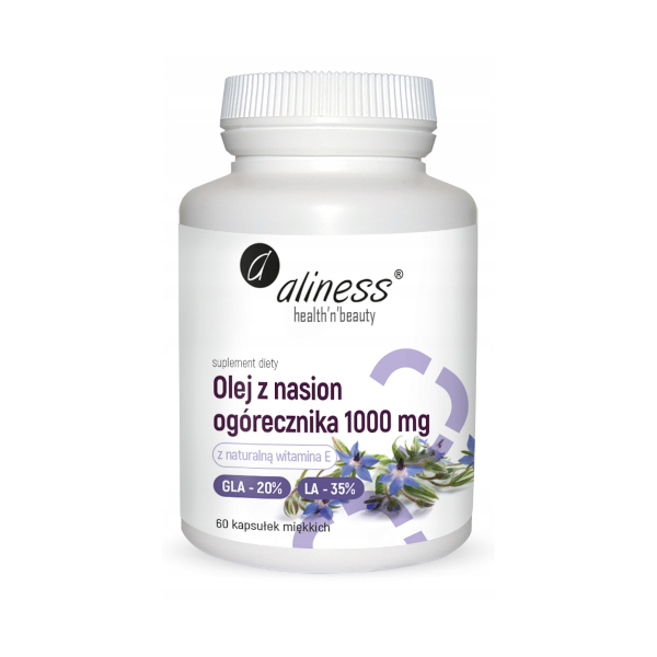 Aliness Olej z nasion ogórecznika 1000 mg to źródło naturalnych kwasów tłuszczowych omega-6 w przystępnej formie miękkich kapsułek. Produkt zawiera wysokiej jakości, naturalny olej pozyskiwany z nasion ogórecznika lekarskiego, który charakteryzuje się wysoką zawartością kwasu gamma-linolenowego (20% GLA) i kwasu linolowego (35% LA), a także dodatek naturalnej witaminy E (D-alfa-tokoferol).