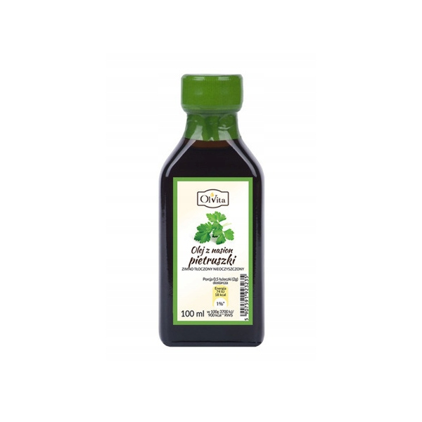 Olej z nasion pietruszki zimnotłoczony Olvita 100ml – Tłoczony na zimno olej o intensywnym smaku i zapachu. Wykorzystywany jest w kosmetyce. Reguluje wypróżnienia, działa uelastyczniająco na skórę oraz przyspiesza regenerację naskórka.