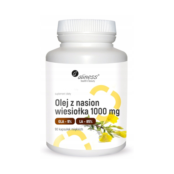 Aliness Olej z nasion wiesiołka 500 mg to źródło naturalnych kwasów tłuszczowych omega-6 w przystępnej formie miękkich kapsułek. Produkt zawiera wysokiej jakości olej, pozyskiwany z nasion wiesiołka dwuletniego, który charakteryzuje się wysoką zawartością kwasu linolowego (85% LA) oraz kwasu gamma-linolenowego (9% GLA). Olej pozyskiwany jest metodą tłoczenia na zimno, dzięki czemu zachowuje wszystkie wartości odżywcze i stanowi znakomite uzupełnienie diety w niezbędne nienasycone kwasy tłuszczowe (Omega-6).