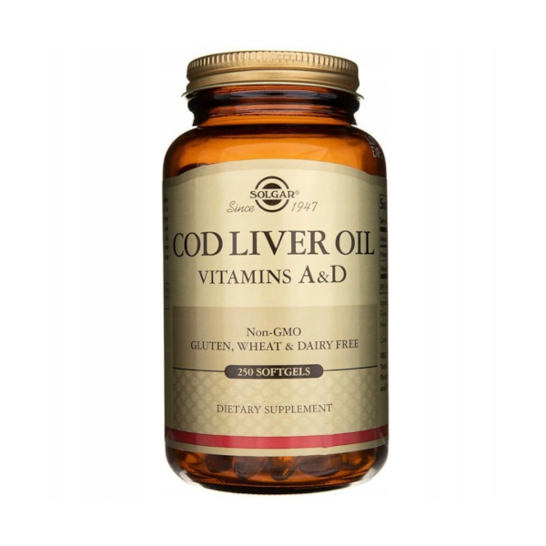 Cod Liver Oil Vitamins A & D marki Solgar to suplement diety w kapsułkach żelowych zawierający olej z wątroby dorsza dostarczający witaminy A i D, aby wspierać zdrowy układ odpornościowy, wspomagać zdrowie oczu i wzroku oraz pomagać zachować zdrowe kości.