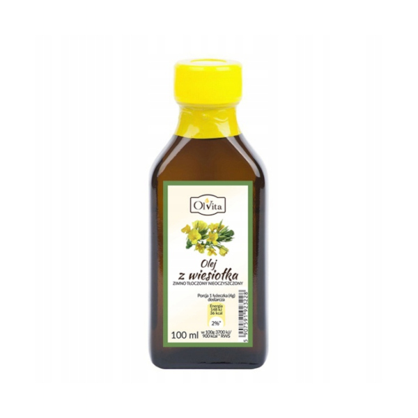 Olej z wiesiołka zimnotłoczony Olvita 100ml – Olej tłoczony na zimno z nasion wiesiołka dwuletniego (Oenothera biennis Linne). Wspiera procesy regeneracyjne skóry, pobudza proces odnowy tkanek oraz wzmacnia paznokcie i włosy. Przeznaczony jest do skóry m. in. suchej i zniszczonej.