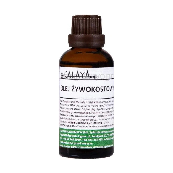 Olej Żywokostowy – Olej żywokostowy wytwarzany jest poprzez macerację korzeni w oleju słonecznikowym. Olej żywokostowy korzystnie wpływa na skórę. Przynosi ulgę stawom i plecom. Dobrze działa na skórę problemową, łagodzi podrażnienia.