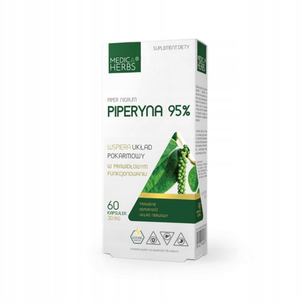 Piperyna 95% jest preparatem pozyskanym z owoców pieprzu (Piper nigrum). Piper nigrum wspiera właściwe funkcjonowanie układu pokarmowego poprzez wspomaganie prawidłowego procesu trawienia. Dzięki temu sprzyja utrzymaniu właściwej masy ciała, zwłaszcza gdy jest stosowany w połączeniu ze zrównoważoną dietą. Dodatkowo Piper nigrum wspiera prawidłowe działanie systemu odpornościowego i nerwowego.