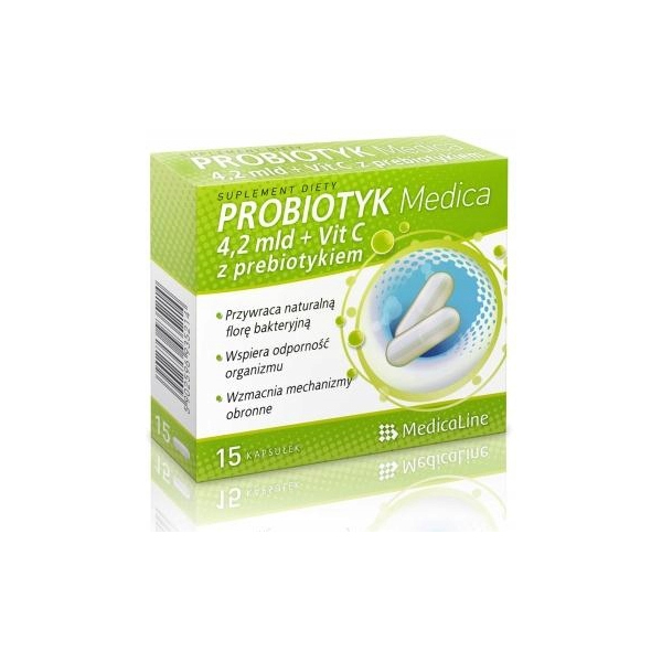 Głównymi składnikami suplementu diety Probiotyk Medica 4,2 mld+VitC z prebiotykiem są trzy szczepy bakterii probiotycznych (łącznie 4,2 mld bakterii w każdej kapsułce) lactobacilus planatarum, lactobacilus rhamnosus oraz bifidobacterium animalis, które przyczyniają się do przywrócenia naturalnej mikroflory bakteryjnej, wspierają odporność organizmu i wzmacniają jego mechanizmy obronne oraz prebiotyk w postaci błonnika akacjowego. Witamina C pomaga w prawidłowym funkcjonowaniu układu odpornościowego.