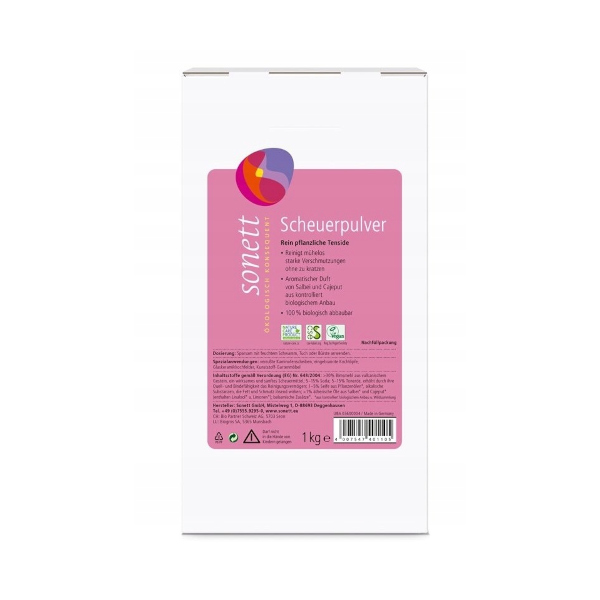 Zawiera czysto roślinne środki powierzchniowo czynne. Czyści bez wysiłku silne zabrudzenia, nie pozostawiając zarysowań. Zawiera aromatyczne olejki eteryczne: szałwiowy i kajeputowy z upraw ekologicznych. Proszek do szorowania Sonett ulega biodegradacji w 100%.