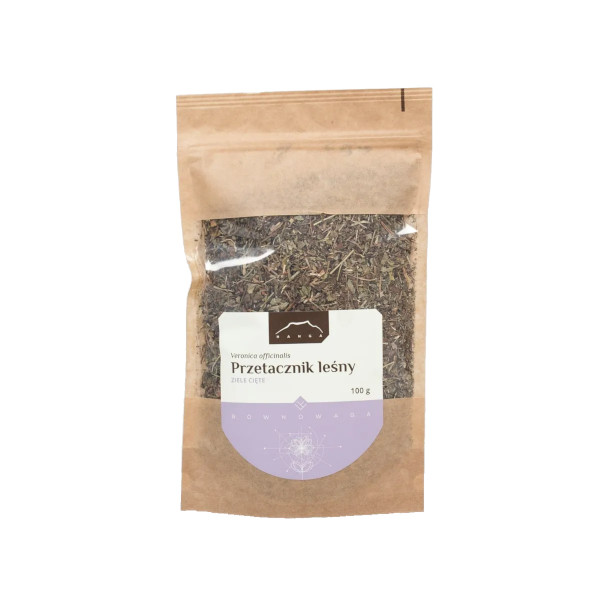 Przetacznik leśny (Veronica officinalis) – niewielka bylina charakteryzująca się ząbkowanymi liśćmi i drobnymi, fioletowo-niebieskimi kwiatami. Rośnie dziko na terenie całej Europy i w Zachodniej Azji. W Polsce występuje powszechnie. W celach zielarskich pozyskiwane jest ziele przetacznika, bogate w składniki aktywne: glikozydy irydoidowe, flawonoidy, kwasy fenolowe, saponiny i garbniki. Według dawnych wierzeń przypięcie kwiatów przetacznika do ubrania pomagało uniknąć wypadków. W medycynie ludowej ziele Veronica officinalis wykorzystywano dla wzmocnienia odporności oraz podczas detoksykacji. Działa ono bowiem moczopędnie i pomaga oczyścić krew ze zbędnych produktów przemiany materii. Jednak to nie jedyne jego zastosowania. Przetacznik wpływa dobrze także na układ oddechowy i pomaga delikatnie zrelaksować ciało i umysł. Można przygotować z niego zimny wyciąg służący do pielęgnacji podrażnionych części ciała. Warto zaopatrzyć swoją ziołową apteczkę w to cenne zioło i sięgać po nie, gdy czujemy się osłabieni lub potrzebujemy wesprzeć procesy oczyszczania.