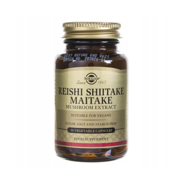 Suplement diety w kapsułkach roślinnych Reishi Shitake Maitake Mushroom Extract marki Solgar. Zawiera ekstrakt z grzybów: Reishi (Ganoderma lucidum), Shitake (Lentinus edodes) oraz Maitake (Grifola frondosa).