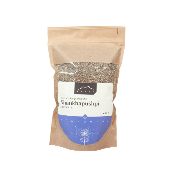 Shankhapushpi (Convulvulus pluricaulis) – roślina pnąca, należąca do rodziny powojowatych, wytwarzająca białe kwiaty o kielichowym kształcie. Występuje głównie w Indiach, ale można spotkać ją także na południowo-wschodnich obszarach Azji oraz w Afryce. Surowcem zielarskim jest nadziemna część rośliny, zawierająca takie substancje aktywne, jak: shankhapushpina, konwolamina, skopoletyna, fitosterole, kwasy tłuszczowe oraz składniki mineralne. Shankhapushpi cenione jest za swój korzystny wpływ na pracę mózgu i całego układu nerwowego. Według Ajurwedy oraz współczesnych badań Convulvulus pluricaulis wyraźnie zwiększa poziom koncentracji, ułatwia zapamiętywanie, a także koi napięcie, relaksuje i przynosi dobry sen. Z tej indyjskiej rośliny przygotować można napar lub spożywać jej suszone ziele bezpośrednio w postaci proszku. Codzienne spożywanie shankhapushpi uspokaja rozbiegany umysł oraz wpływa na wzrost życiowego wigoru. Convulvulus pluricaulis polecane jest osobom przemęczonym oraz w okresach intensywnej nauki lub pracy intelektualnej.