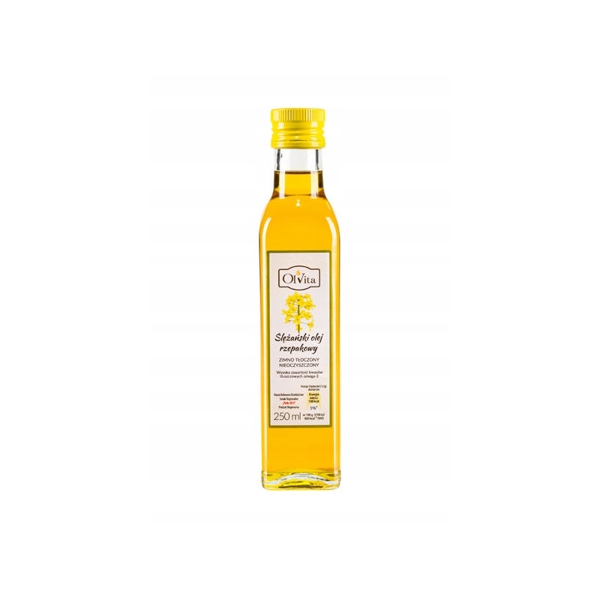 Olej rzepakowy zimnotłoczony Olvita 250ml - polski olej rzepakowy tłoczony na zimno, o pięknym bursztynowym kolorze i wysokiej zawartości tłuszczów Omega 3.
