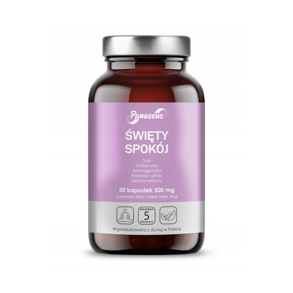 Panaseus Święty spokój to wydajne połączenie ekstraktów roślinnych które mają właściwości adapotegenne i pomagają odzyskać siły po stresujących wydarzeniach.