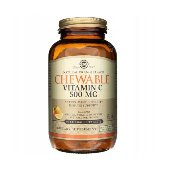 Chewable Vitamin C 500 mg Orange Flavor marki Solgar to suplement diety w pastylkach do ssania zawierający witaminę C o pysznym smaku pomarańczy.