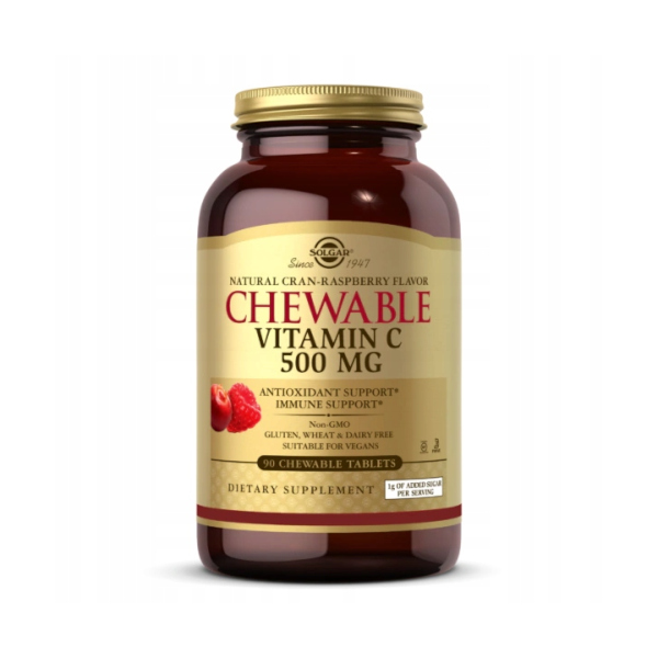 Chewable Vitamin C 500 mg Cran-Raspberry Flavor marki Solgar to suplement diety w pastylkach do ssania zawierający witaminę C o pysznym smaku żurawinowo–malinowym.