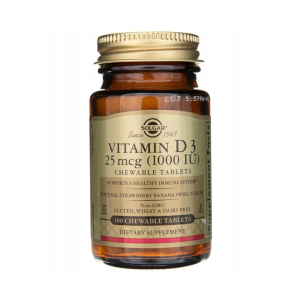 Vitamin D3 1000 IU (25 µg) marki Solgar to suplement diety zawierający witamine D w formie cholekalcyferolu w postaci pastylek do ssania o smaku truskawkowo-bananowym.