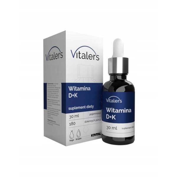 Witamina D3 + K2-MK7 marki Vitaler's to suplement diety w kroplach zawierający witaminy D oraz K. Witamina D pomaga w prawidłowym funkcjonowaniu układu odpornościowego oraz mięśni. Witamina K pomaga w utrzymaniu zdrowych kości oraz przyczynia się do prawidłowego krzepnięcia krwi.