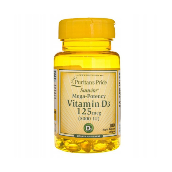 Vitamin D3 5000 IU to suplement diety w kapsułkach żelowych od Puritan's Pride. Zawiera unikalną formułę SUNVITE D3, która jest dobrze przyswajalną formą witaminy D. Suplement diety dla osób zdrowych powyżej 75 roku.
