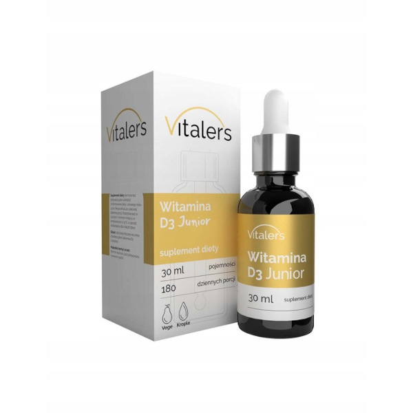 Witamina D3 Junior marki Vitaler's to suplement diety w kroplach stworzony z myślą o dzieciach zawierający witaminę D3. Witamina D pomaga w prawidłowym funkcjonowaniu układu odpornościowego, oraz mięśni potrzebna dla prawidłowego wzrostu i rozwija kości u dzieci.