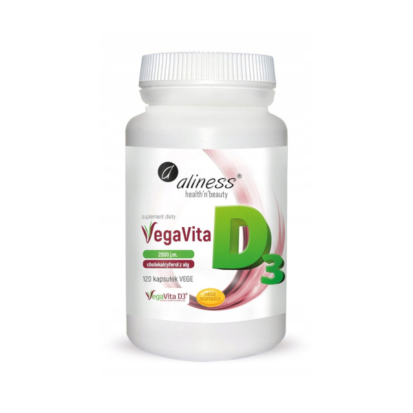 Wegańska Witamina D3 marki Aliness to cholekalcyferol pochodzenia roślinnego w opatentowanej postaci VegaVitaD3®, pozyskiwany z alg. Produkt dostępny jest w formie miękkich kapsułek w 100 % pochodzenia roślinnego, dzięki czemu stanowi odpowiednie dla wegan źródło witaminy D, w najbardziej przystępnej dla organizmu postaci cholekalcyferolu.