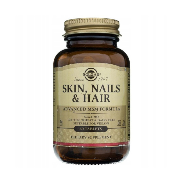 Hair, Skin, Nails Formula marki Solgar to suplement diety zawierający składniki, które organizm wykorzystuje do budowy kolagenu i keratyny, fundamentalnych składników włosów, skóry i paznokci.
